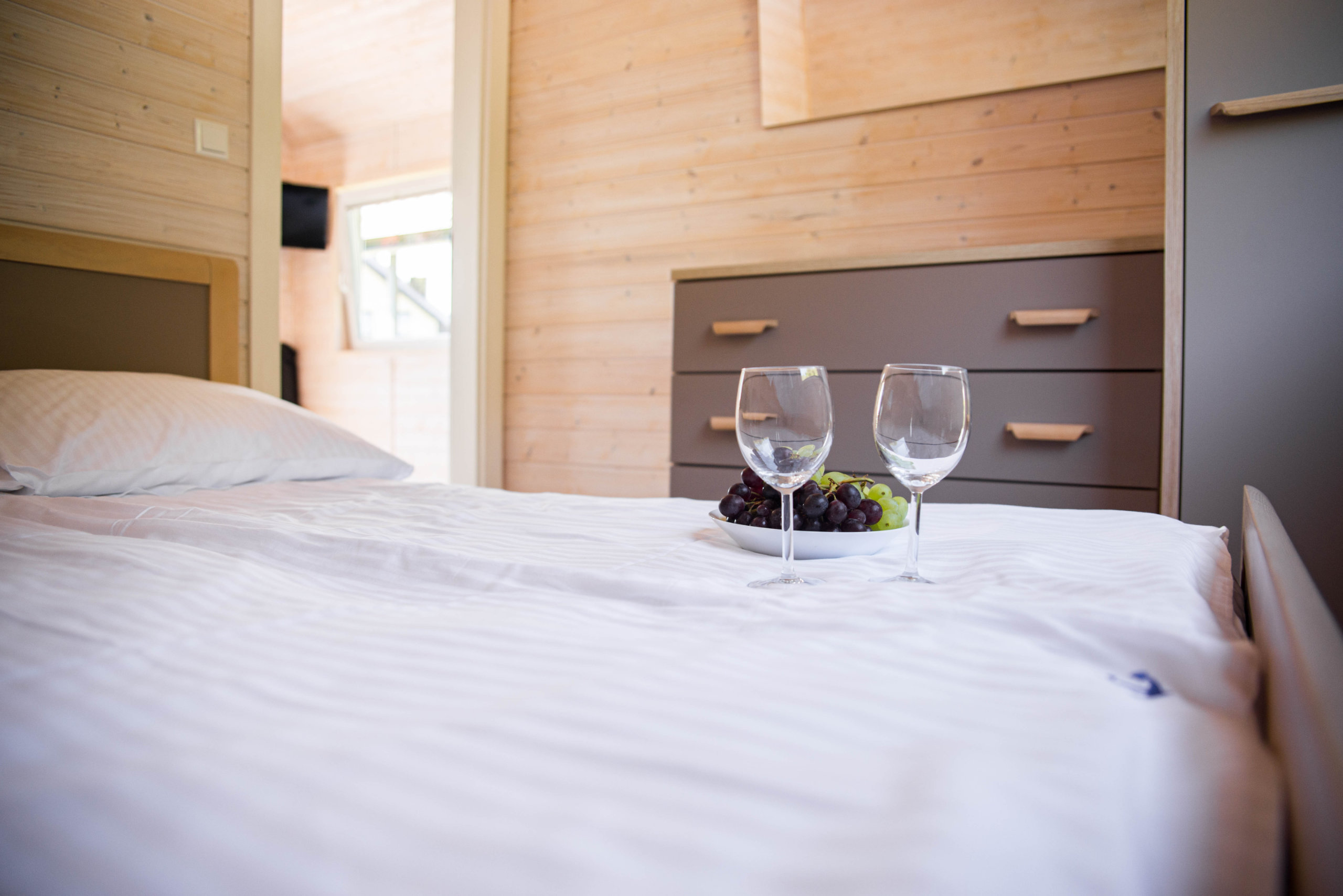 Każdy domek oferuje salon z wygodną rozkładaną kanapą, wielkim oknem na ogród i otwartą na salon kuchnią. Znajduje się tu także sypialnia z łóżkiem małżeńskim oraz łazienka z prysznicem. Z salonu wyjdziecie na duży taras z wygodnymi meblami oraz grillem.